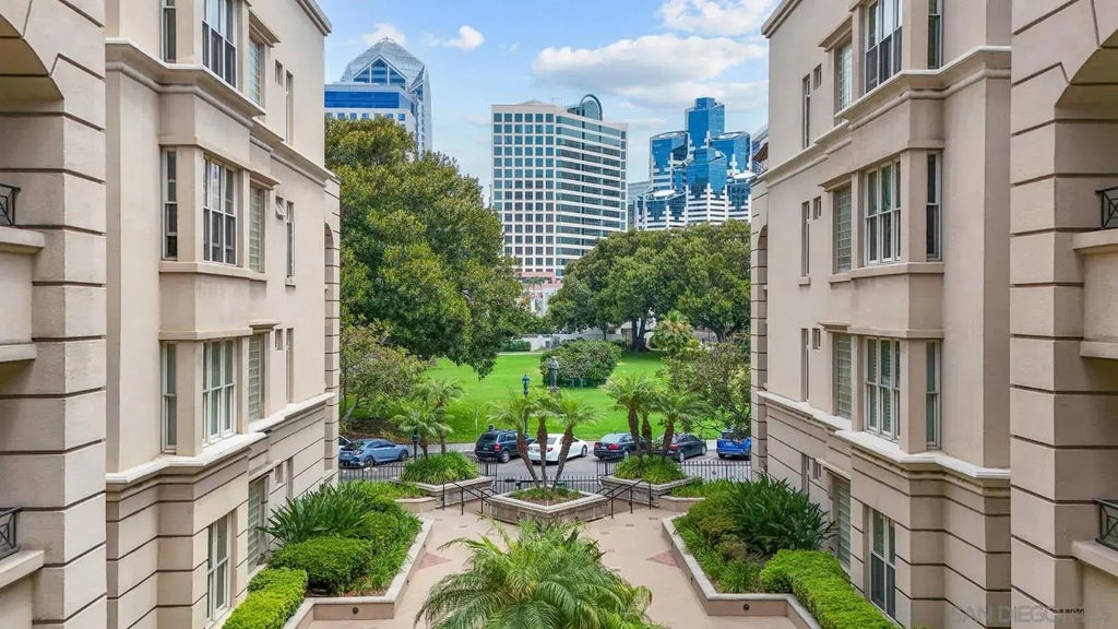 Discover refined living at the Watermark, a boutique condominium community tucked into a quiet pocket of the prestigious Marina District in Downtown San Diego. This spacious 1-bedroom, 1.5-bath residence offers a rare combination of comfort, style, and urban accessibility. Featuring soaring 10-foot ceilings, an open-concept layout, a large kitchen island, and a dedicated powder room for guests, this home lives larger than your average one-bedroom condo. Enjoy tranquil views of the lush courtyard and historic Pantoja Park from your private balcony. The generously sized primary suite includes a walk-in closet and en-suite bath for added convenience. Located just steps from the San Diego Bay, Little Italy, Petco Park, and the Gaslamp Quarter, you’re surrounded by the city’s top restaurants, shops, and cultural landmarks. Additional nearby attractions include the USS Midway, Seaport Village, The New Children's Museum, Eddie V's, Animae, Puesto, The Fish Market, SD Convention Center, and more. If you’re looking for more space, a prime location, and an exceptional value—this is the condo for you!