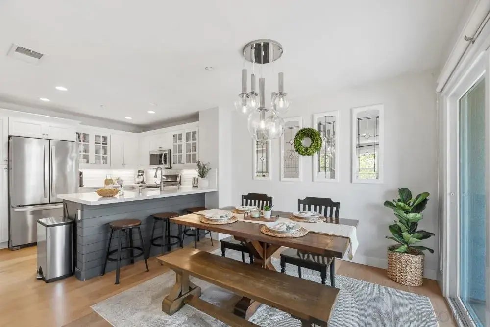 Welcome to 3514 Shoreline Bluff Ln, a beautifully upgraded, light-filled corner townhome in the highly desirable At The Bay community in Point Loma. This 2-bedroom, 2.5-bath home has been thoughtfully renovated throughout with engineered hardwood floors, quartz countertops, updated cabinetry, custom window treatments, and woodwork details including board and batten in the entry and shiplap in the half bath. The formal entry features two closets for added storage, while the spacious primary suite offers a walk-in closet and en-suite bath. A full-size laundry room with a newer washer, dryer, and built-in storage is conveniently tucked away from the main living space. The attached 2-car tandem garage provides direct access and additional storage. This move-in ready home is part of one of the newer communities in the area and offers some of the lowest HOA dues around. VA approved. Enjoy peaceful views of the pool, clubhouse, and playground from this prime end-unit location. Situated in the heart of coastal San Diego, you're just minutes from Liberty Station, Shelter Island, Mission Bay, SeaWorld, Downtown, and the waterfront.
