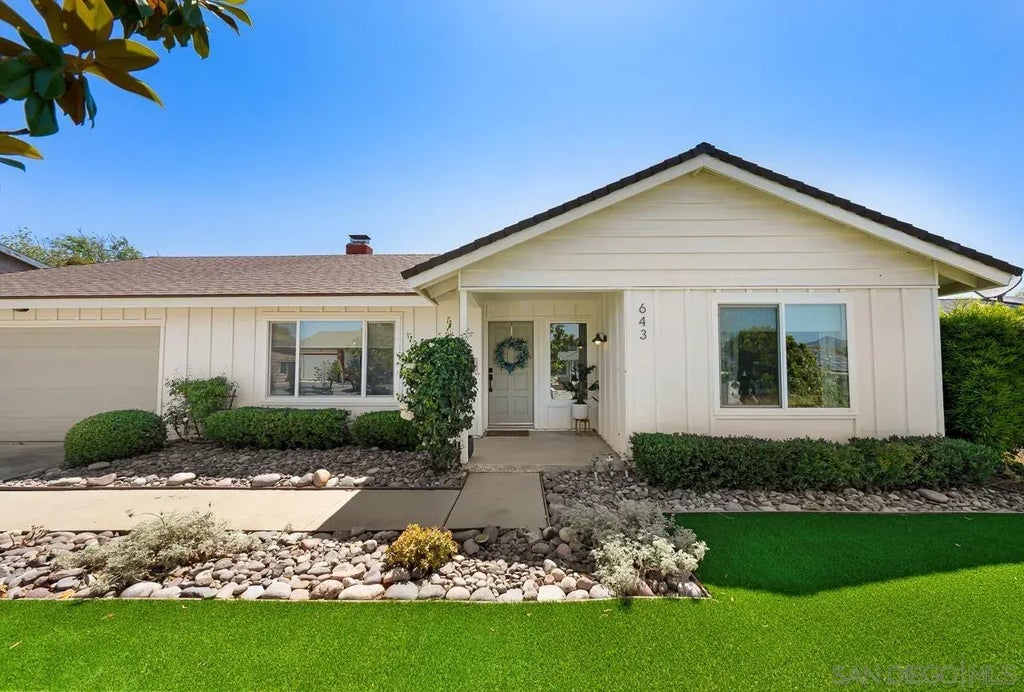 Relaxed Style & Backyard Views – Move-In Ready Gem! Welcome to this beautifully updated 3 bedroom, 2 bath home perfectly blending modern comfort with California charm. Offering open-concept living with thoughtful upgrades, including luxury vinyl plank flooring throughout, modern baseboards and trim, dual-pane windows, central air and heat as well as ceiling fans, and recessed lighting. The kitchen is a standout with all-wood cabinetry, quartz countertops, a deep farm sink, and newer appliances—perfect for everyday living and entertaining. The custom mudroom offers practical elegance with bold navy walls, built-in storage, washer, dryer and seating—perfect for keeping life organized. Step into a serene primary bedroom with ensuite bathroom, neutral tones, and designer touches that create a cozy, stylish retreat. Out back, your private oasis awaits. Take in west facing views while cooling off in the fenced sparkling pool or lounging poolside under the blue sky. The elevated backyard features turf, drought tolerant landscaping, and a covered patio, creating the ideal setting for relaxing or hosting guests. This home is a must-see for anyone seeking a designer look with functionality, and is also for perfect indoor-outdoor lifestyle.