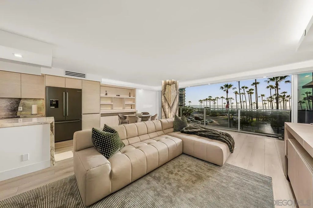 Sophistication meets coastal luxury in this fully reimagined rare, larger 1-bedroom, 2-bathroom oceanview residence. This home was taken down to the studs with every inch reflecting curated design and craftsmanship. Discover raised ceilings, custom seamless cabinetry, luxury laminate flooring, high-end fixtures, and designer LED lighting throughout. The kitchen stuns with Patagonia quartzite slabs, showcasing dramatic natural movement and elegance rarely seen, paired with black stainless Bosch appliances. The Italian Porcelains tile bathrooms are completely customized, and both the custom doors and built-ins elevate the home’s clean, modern aesthetic. A wall of floor-to-ceiling 25-foot sliding glass doors reveals panoramic beach views over the pool and tennis courts, with an expanded balcony that brings the outdoors in. A unique opportunity exists to purchase the ACTIVE adjacent unit #209 and combine the two, creating over 2,600 sq.ft.