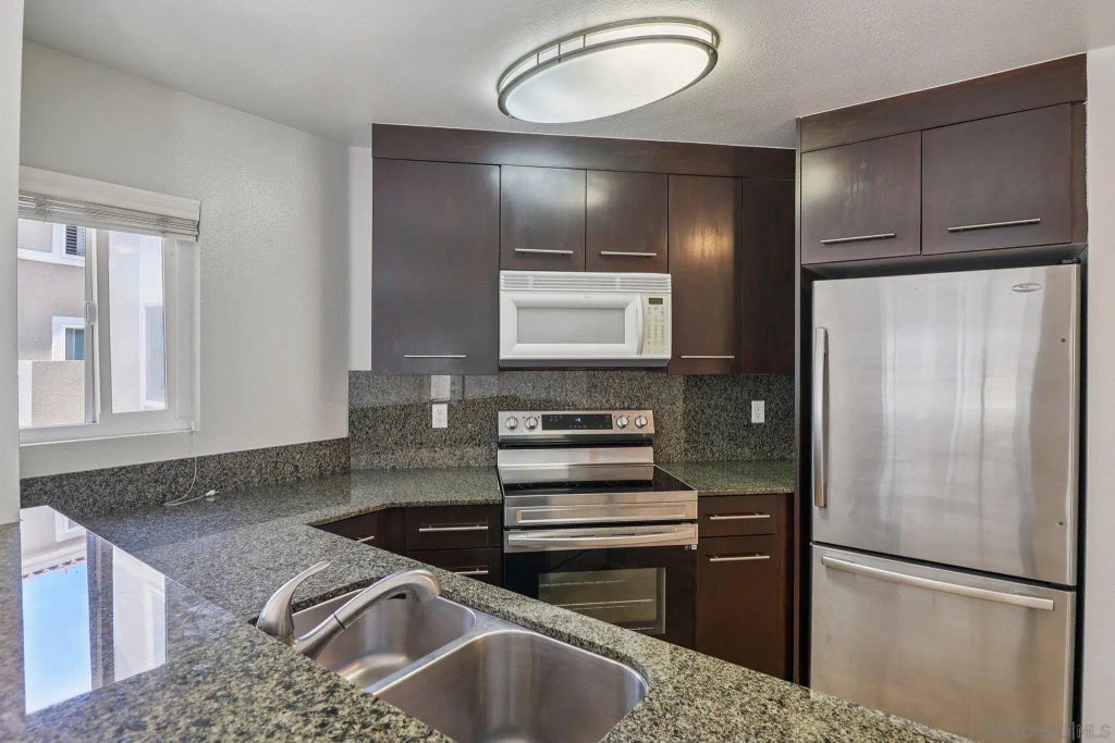 Resort living at its finest!! Desirable & bright open floor plan, corner unit, first floor, with newer double pane vinyl windows. Painted with neutral colors with a beautiful kitchen. Unit has private patio with storage, secured underground parking + permit only parking, stackable washer & dryer, fitness center, 2 pools with hot tubs, internet cafe, and beautiful greenbelt for your enjoyment. All major kitchen appliances with refrigerator, washer and dryer are included.