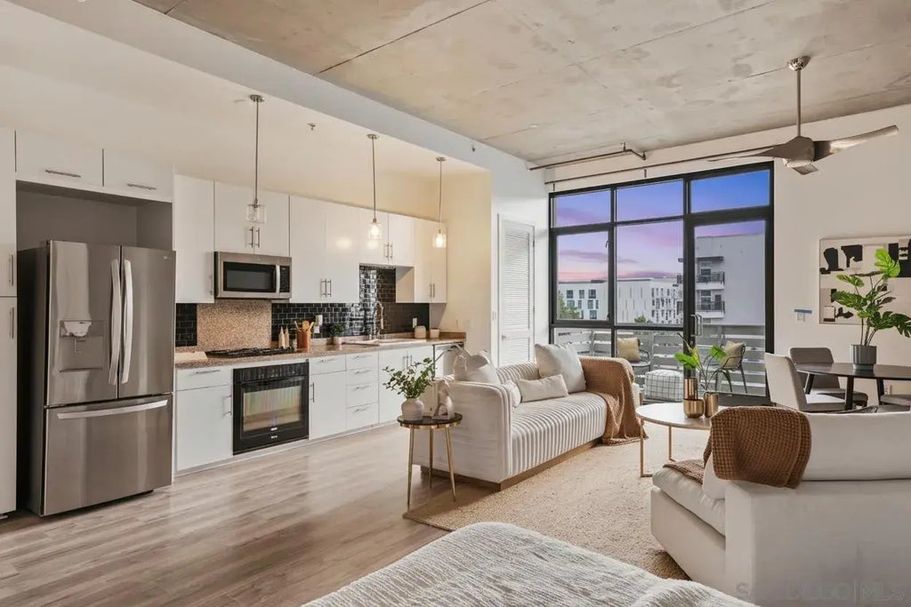 Step into modern city living with this stunning 5th-floor loft in M2i. The condo showcases exposed concrete elements and 11 ft ceilings, offering dramatic floor-to-ceiling windows opening onto a serene 10 ft balcony with beautiful city views. With new vinyl plank flooring and fresh paint, this spacious loft is turn key and move in ready! With outstandingly low HOA dues, M2i features a state-of-the-art fitness center, a rooftop lounge with BBQ grills and panoramic views, a tranquil recently renovated courtyard with a water feature, secure underground parking, and bike storage. Two distinct lobbies, each with its own modern design, greet you, evoking feelings of belonging every time you walk through the doors. Safety is a priority, with secure entry and underground parking. The beautifully landscaped courtyard serves as your oasis in the midst of the bustling city. Parking is never an issue with one underground spot, with the possibility to install an electric charging port. Developed by Citymark in 2006, M2i transformed a full city block in the Ballpark District of East Village; Just a stone’s throw away from the iconic Petco Park, with top rated culinary adventures just steps away. The Ballpark District spans 22 blocks surrounding Petco Park, where the Padres-affiliated Ballpark District Community Partnership provides daily clean-up services to maintain the area. Whether you are seeking a chic urban retreat or a fantastic investment opportunity, this condo combines style, convenience, and value in one of the most sought-after complexes in the Ballpark District.