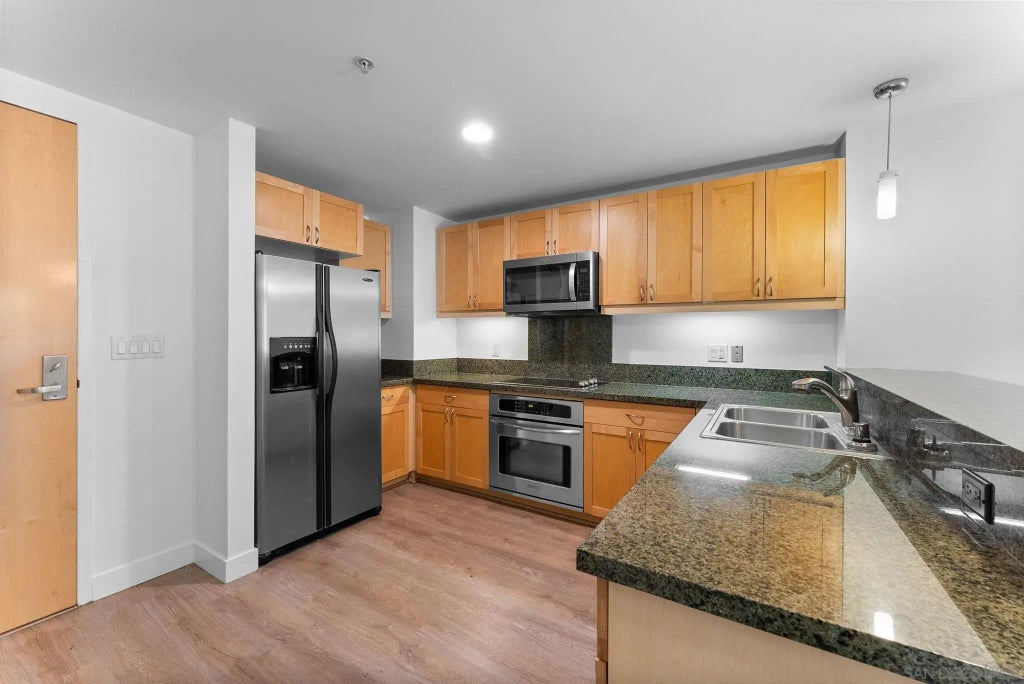 Beautiful 1 bedroom plus den/office in the Metrome building, perfectly located in the heart of East Village. This light-filled, exterior-facing unit features large windows, upgraded laminate flooring with premium carpet, a modern bathroom with stylish azure chevron tile, AC, and the convenience of an in-unit washer/dryer. The kitchen offers ample cabinet space and a breakfast bar counter, perfect for everyday living or entertaining. The versatile den is ideal as a home office, guest room, or even a second bedroom. One parking space and one storage unit are included, along with access to Metrome’s amenities such as a resident lounge, fitness center, and secure bike storage—all just steps from Petco Park, the library, and great dining options.