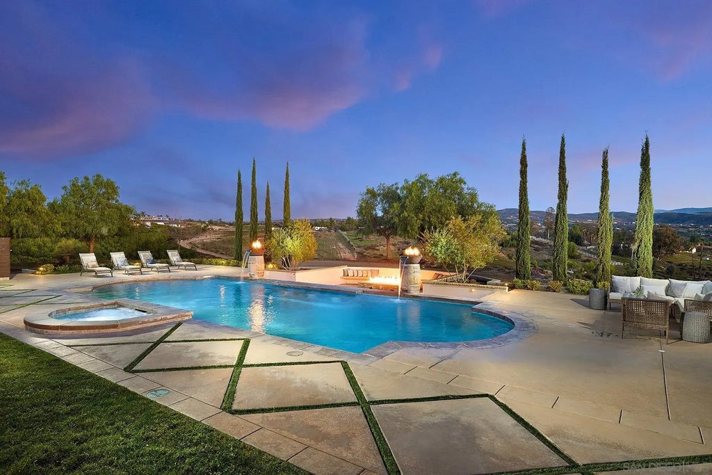Exquisite Sunset Orientation, set amidst the rolling vineyards and breathtaking landscapes of Temecula’s Wine Country, this extraordinary well built with attention to detail, single-story 4.7-acre estate is on the market for the first time. It is a masterpiece of refined luxury and resort-style tranquility, offering a true retreat experience. A winding illuminated driveway lined with cypress trees and drought-tolerant landscaping leads to an elegant circular motor court, where stately olive trees evoke the charm of a private vineyard retreat. Enjoy expansive open spaces, sophisticated craftsmanship, and panoramic sunset views. The main residence is approximately 3,000 square feet, accompanied by an 800-square-foot one-bedroom casita over the garage. An additional pad is available for a larger ADU, casita, guest house, RV storage, car collection, workshop, stables, sport court, or ideal for equestrian facilities. 2x6 construction, R19 insulation make this home very energy efficient. Every element of the estate has been meticulously designed to deliver a seamless blend of luxury, durability, and convenience. The East Wing welcomes you with a bright, inviting great room. Floor-to-ceiling Milgard double-pane windows showcase rolling vineyard vistas. A striking fireplace connects the great room to a casual dining area. The gourmet kitchen features luxurious countertops and an open-concept flow into a formal dining room—perfect for elegant gatherings.