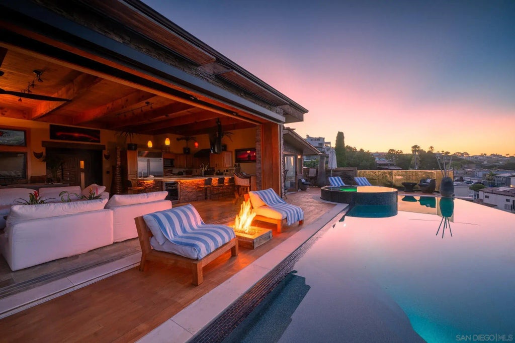 Your private resort awaits! This stunning 4 bedroom, 4 and 1/2 bath home is neslted in one of San Diego's most coveted hilltop neighborhoods offering breathtaking 180 degree south west facing views of the Pacific Ocean, Mission Bay, Downtown and all the way to Mexico! Enter into your new home overtop a bridged koi pond and open the Polenysian inspired entrance into the open entertainer's great room and Kitchen. In front of you will be 20 foot sliding glass wall where your infinity edge pool & Spa await you. Other features of this resort inspired home are; Sauna, two steam showers, Putting Green, Custom Wine Closet, Saltwater Fish Tank, Full weight rack in the Garage. This property comes fully furnished with high end pieces from Restoration Hardware.
