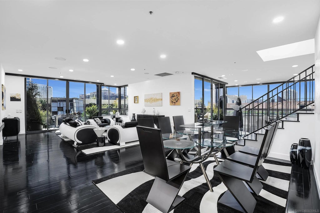 Live the life at the Meridian San Diego! Unfurnished price is $7950 per month, Furnished price is $10,000 per month. This exceptionally distinctive townhome-style unit, situated at the southwest corner of the 4th and 5th floors, offers expansive interior spaces that create a living experience akin to that of a traditional home. The four generous outdoor patios provide a tranquil retreat. Featuring a striking color palette, this residence showcases sleek contemporary decor while residing in a building that exemplifies five-star service and unparalleled distinction, a rarity in today's market. Enhanced with refinished hardwood flooring, brand new California closet systems, premium motorized window treatments, high-end appliances, recessed lighting, in-unit laundry, an electric fireplace, and numerous additional features, this home is truly remarkable. The building boasts a full array of amenities, including valet parking, security concierge, and an impressive outdoor plaza level complete with a pool, spa, firepit, health club, barbecue area, and a park-like environment that softens the surrounding urban landscape. Meeting rooms, lounges, and Guest suites are available for visitors and are managed by the building staff. The Meridian stands as San Diego's sole building that genuinely embodies 5-star luxury. Once experienced, the distinction is unmistakable.