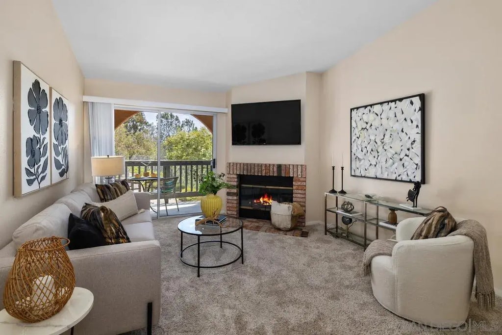 Charming 3rd (top) floor 1 bd/1 ba east facing (keeping it cooler) end unit condo at Lucera in UTC with beautiful canyon views. Quiet unit with vaulted ceilings, balcony with storage unit, large walk-in closet in bedroom, washer & dryer in unit, granite countertops, tile floors in kitchen & bathroom, fireplace in LR, stainless steel appliances, plenty of storage, detached garage, and ample open parking for guests. Condo has only one shared wall. Garage optimally located across from Bldg entrance, visible from unit. Bldg has elevator.