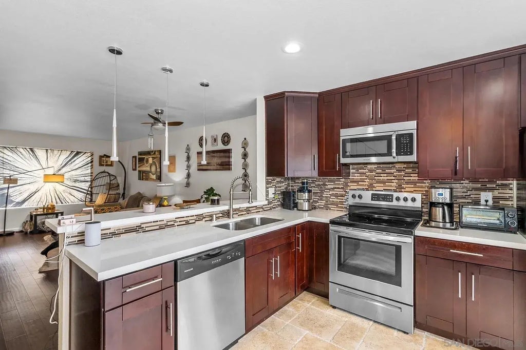 Completely remodeled modern townhouse featuring a large private back patio. The kitchen and bathrooms have been fully renovated, and the unit boasts hardwood & tile flooring throughout no carpets. In-unit washer and dryer provided for convenience. The master and second bedrooms are on the second floor and share a full bathroom. Enjoy the luxury of two designated parking spots one covered with storage and the other uncovered. The complex offers amenities like a private park, a swimming pool, and basketball courts. Conveniently situated near shopping centers, entertainment venues, schools, and major freeways. Special military discounts available, and pets are allowed with specific restrictions. 6 month lease minimum. Renter assumes all costs associated with water, electricity & TV/Internet