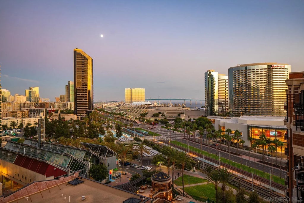 Discover contemporary luxury in this fully reimagined 1-bedroom, 2-bath penthouse at the iconic CityFront Terrace. Once a 2-bedroom, this sleek and spacious home can easily be converted back, or enjoyed as an expansive 1-bedroom retreat with open, light-filled living areas that frame stunning city and bay views. A spacious view balcony adjoins the living area, creating seamless indoor/outdoor living and the perfect space to relax or entertain. A state-of-the-art kitchen boasts quartz waterfall counters, custom cabinetry, and premium stainless appliances, while both baths impress with stone tile, smart mirrors, and designer fixtures for a spa-like ambiance. Hardwood floors, surround sound, recessed lighting, and thoughtful upgrades elevate the home’s modern design. Parking is effortless with a prime garage space just steps from the elevator (self-park or valet) plus a private storage unit. CityFront Terrace seamlessly blends modern living with historic charm as part of the restored Citrus Soap Factory. Residents enjoy 2 heated pools, spa, BBQ pavilion, outdoor dining, firepit, entertainment lounge, fitness center, sauna, business facilities, and 24/7 front desk service—all with remarkably low HOA fees. Stroll through the serene urban courtyard with its tranquil water feature, the perfect retreat in the heart of downtown. Situated in the Marina District, this home offers unmatched access to San Diego’s waterfront, Gaslamp Quarter, Little Italy, Petco Park, dining, shopping, and vibrant nightlife.