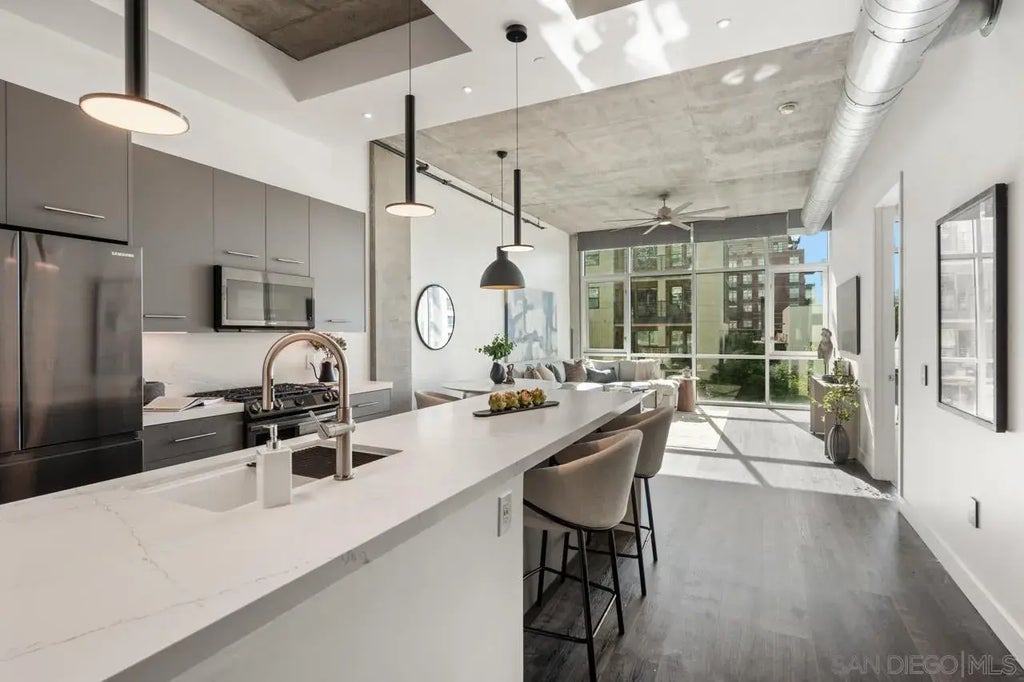 Step into a fully upgraded condominium in the heart of East Village. Designed by a principal of a respected interior design firm, this home has been thoughtfully updated with attention to detail. The open floor plan features recessed LED lighting and durable laminate flooring. At the center of the home, the kitchen is equipped with Euro-style cabinetry, Silestone countertops with a waterfall edge, and under-cabinet lighting for a clean, modern look with upgraded appliances. The bathrooms have been fully renovated with modern, high-end finishes. The primary features a glass tile shower surround with Silestone niche, ceiling rain head, hand shower, and frameless European glass door. New Euro-style vanity cabinets with Silestone countertops. The primary bedroom offers comfort with wall-to-wall carpeting and custom California closets for storage. Smart home features include remote-controlled electric shades, a Nest doorbell with camera, and SwitchBot remote access for the unit door. Building amenities include Amazon delivery lockers and Google Fiber Webpass with 1G internet—all included in the HOA fees. Nestled in the dynamic and walkable East Village neighborhood, this home blends luxury finishes with unbeatable access to San Diego’s top dining, shopping, and entertainment.