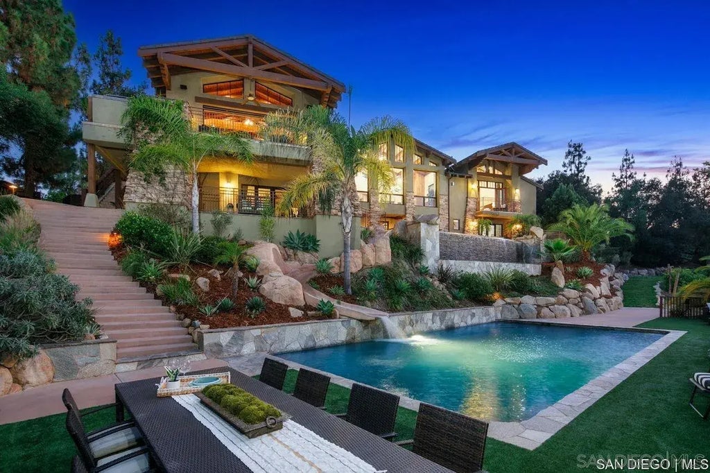 Nestled in the hills of San Diego, 18787 Aceituno St is a Craftsman-inspired masterpiece modeled after the iconic Torrey Pines Lodge, offering panoramic views and resort-style living. This 5-bedroom home with office and bonus room features soaring vaulted beam ceilings, expansive living spaces, and vanishing pocket doors for seamless indoor-outdoor flow. The gourmet kitchen boasts dual Miele dishwashers, a Viking professional suite, built-in BBQ, and Sub-Zero refrigeration, ideal for entertaining. The entry-level master retreat includes a fireplace, private balcony, spa-like bath, and dual walk-in closets. Outdoor living is highlighted by a vanishing-edge pool with waterslide, multiple terraces, sweeping views, and a boutique vineyard. The family level offers a game room, wet bar, and en-suite bedrooms opening to the backyard. Modern upgrades, whole-home audio, WiFi pool controls, multi-zone HVAC, fire-aware sprinklers, and fully owned solar, ensure efficiency and comfort. A 3-car garage and fine craftsmanship complete this ultimate Southern California lifestyle.