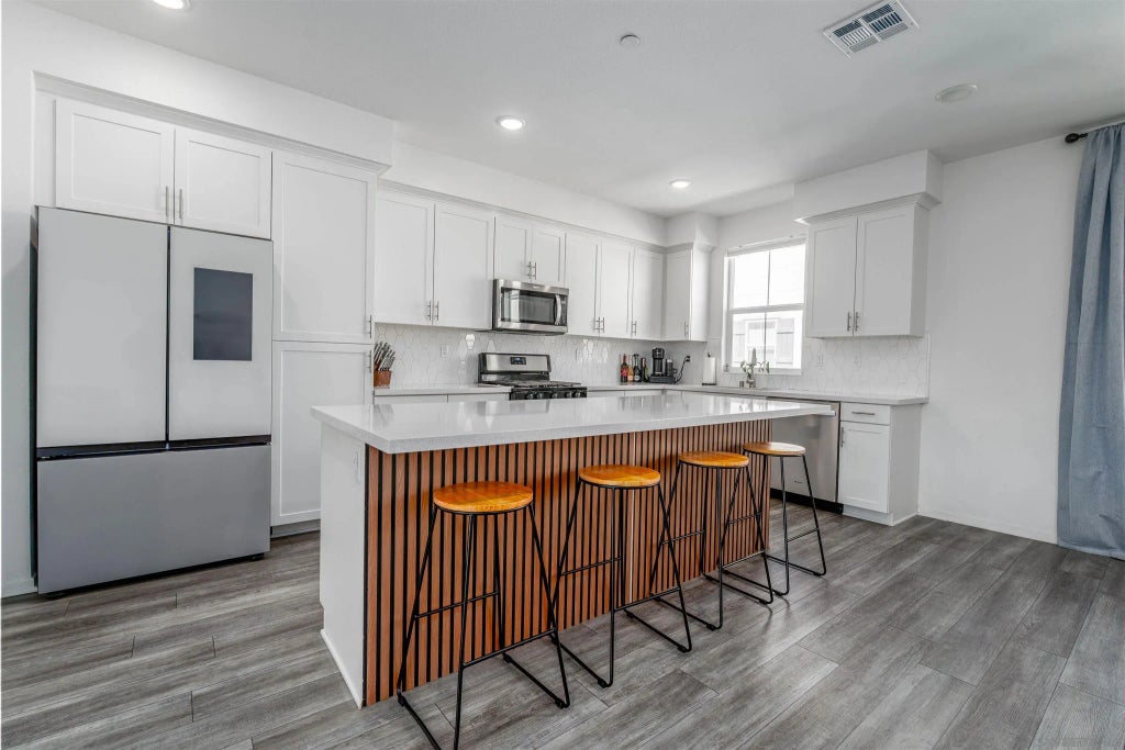 The LARGEST floor plan in this sought-after Escondido community, offering modern living across all levels and PAID OFF solar! The home features a versatile first-floor flex space, a spacious open-concept main living area, and a bright kitchen with a 5 burner stove, Smart refrigerator, and tiled backsplash. The primary suite includes an upgraded tiled shower and walk-in closet, while all bedrooms are equipped with ceiling fans for year-round comfort. Stylish upgrades include luxury vinyl plank flooring throughout the main living areas, tiled bathrooms, and a private deck off the living room. Energy efficiency is built in with a tankless water heater, Quick Cool fan system, and a 3.5kW solar system, complemented by smart home features such as app-controlled lighting, thermostats, and a garage door with integrated camera. Residents enjoy resort-style amenities including a sparkling pool and spa, fire fit, lounge area, multiple BBQs, a children's playground, and a shared outdoor patio with TV and seating. An indoor community gym is also planned. Perfectly situated at the quiet back end of the neighborhood, the home offers added privacy while still being close to everyday conveniences. Just off Interstate 15, you'll have quick access to stores, gas stations, and vibrant dining. This turnkey home combines comfort, innovation, and location -- ready for its next chapter.