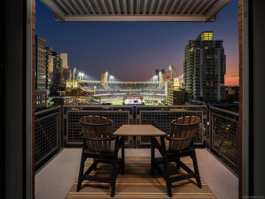 Panoramic ballpark views highlight this distinguished Parkloft residence, with a rare and highly sought-after floor plan. Soaring 10-foot ceilings with exposed ductwork, Pella windows, white brick and concrete wall accents capture the essence of industrial yet elegant loft living. This fully remodeled residence features a brand new chef’s kitchen, showcasing bespoke cabinetry, waterfall-edge quartz countertops, slate subway tile backsplash and Thermador appliances with a 5 burner gas cooktop. Both bathrooms were completely reimagined featuring new cabinetry, quartz countertops, Toto toilets and a large soaking tub with glass shower in the primary bath. New engineered hardwood floors extend throughout the loft, enhancing its modern sophistication while dramatic custom lighting installations create ambiance and architectural intrigue. The expansive Pella windows feature custom motorized shades and open up to the city’s most iconic panoramic Petco Park views. The large private terrace is equipped with gas hookups, perfect for alfresco dining and entertaining. A large storage unit and two (2) oversized side by side parking spaces are deeded to this unit, and both located a few steps from the elevators. Parkloft features a state of the art underground parking garage with tall ceilings and robust ventilation systems.