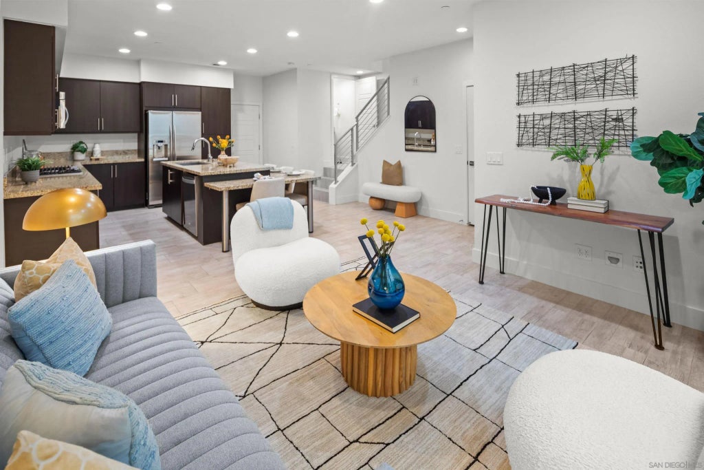 Priced to sell! This beautifully updated three-bedroom, two-and-a-half-bathroom home at Frame & Focus offers 1,470 sq. ft. of stylish living in a light-filled, move-in-ready setting. Perfect for those looking for a fantastic opportunity, this residence combines comfort, value, and a prime Mission Valley location. Step inside to find upgraded flooring throughout the main level and brand-new carpet upstairs. The open-concept layout features a modern kitchen with island seating, ideal for both casual meals and entertaining. Freshly painted throughout, the home feels bright, clean, and ready for its next chapter. Upstairs, you’ll find a spacious primary suite with abundant natural light, a large bathroom, and a walk-in closet. A full walk-in laundry room and plenty of hallway storage add everyday convenience. Just steps away are community amenities including a pool, jacuzzi, and lounge area with a fireplace—perfect for relaxing or hosting friends. This is a rare opportunity to own a turnkey home in Frame & Focus, thoughtfully updated and priced to move.