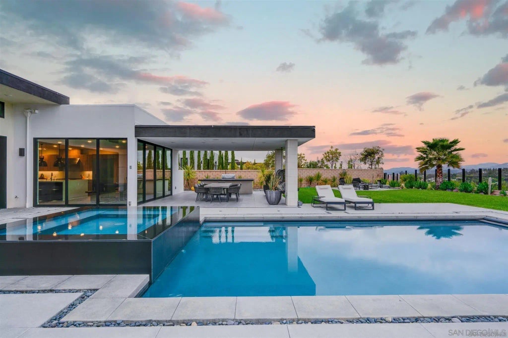 Luxury single-story smart home in the gated Aurora Summit Trails community. Soaring ceilings, abundant natural light, and seamless indoor-outdoor flow define this elegant residence. Features include custom glass-backed built-ins, a sleek bar with wine-wall display, and a chef’s kitchen with oversized island and top-of-the-line appliances. The primary suite offers floor-to-ceiling glass doors, spa-inspired ensuite, and custom walk-in closet. An attached casita is perfect for multigenerational living or can be used as a playroom or home theater. Step outside to a resort-style backyard with pool, oversized spa, outdoor kitchen and bar, and lush green play area. Additional highlights include owned solar, zoned HVAC, and spacious secondary bedrooms. Residents enjoy community pools, spas, fitness centers, event lounges, and scenic parks and trails. Located in an award-winning school district near premier shopping, dining, and the coast.