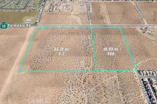 55.05 ac fronting Palmdale Rd/HWY 18 Rd in Victorville. 36.12 ac on the SE corner of Palmdale Rd and Bellflower St is zoned C-2 (Commercial). The adjacent 18.93 ac is zoned PUD (Planned Unit Development). Approximately 1,900 ft of frontage along Palmdale Rd/HWY 18