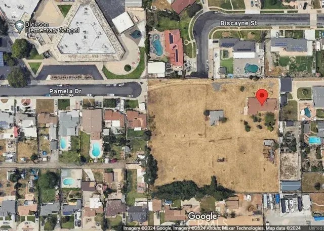 Price Reduced! Motivated Seller! Development opportunity on 2.88 acres (382' x 331'). Tentative tract map no. 20055, application to subdivide into 5 parcels for single-family residential development with lot sizes ranging from 20,144-22,454 Sq ft. Currently, the entrance is through Pamela Drive, future development street entry is possible from Biscayne Street. There is a remodeled house with citrus trees on site. The land is fenced and gated.