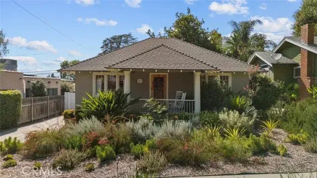 Step into a piece of Monrovias history with this adorable Colonial bungalow, distinguished by its unique Prairie style influences. Built in 1925 by John Henry Barton, who crafted 26 houses and a bungalow court in the area, this home beautifully merges period character with modern amenities. The exterior of this residence stands out with its distinctive features. The Tuscan columns and symmetrical design evoke the Colonial Revival style, while the hipped roof, generous overhanging eaves, and rafter tails add a touch of Prairie elegance. The dash coat stucco, though unusual for its time, contributes a unique charm that complements the architectural style. A drought-tolerant front garden welcomes you to a cozy covered porch, where you can relax and enjoy the surroundings. Enter through the period screen door and original wood entry door to experience the character within. Inside, the living room is a testament to classic charm with its dark stained hardwood floors, decorative fireplace adorned with a mantle, and built-in side bookshelves and sidelights. High baseboards and picture frame moldings add a touch of sophistication, while a ceiling fan ensures comfort. Adjacent to the living room, the breakfast room features built-in corner china cabinets, perfect for displaying your finest wares. The kitchen retains period-appropriate cabinetry with burnished bronze hardware and includes modern updates such as stainless-steel appliances, quartz countertops, and a ceramic tile backsplash with a stylish ribbon accent. The large farmhouse sink with original chrome fixtures and linoleum