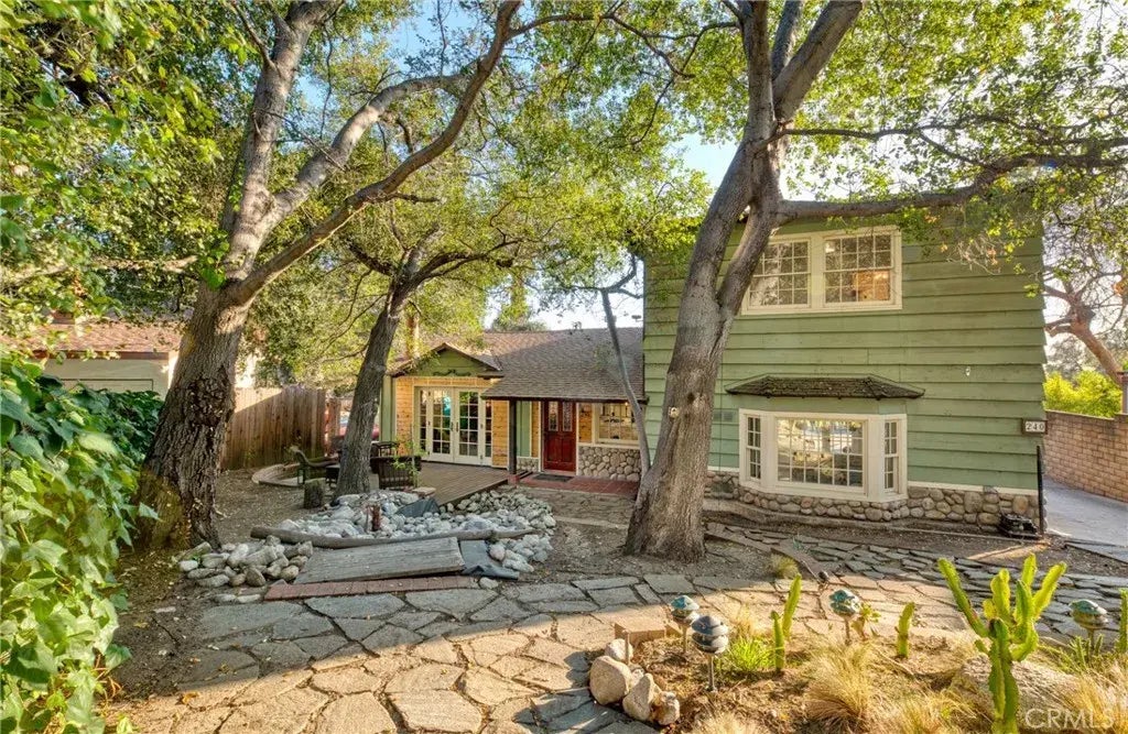 This two-story home, located in the desirable Sierra Madre canyon and sited on a tranquil cul-de-sac, offers a unique opportunity for customization. The main level boasts an open floor plan encompassing a living room with fireplace, dedicated dining area, kitchen equipped with built-in gas cooktop, oven, dishwasher, and bar seating, and a great room. Two generously sized bedrooms, a full bathroom, a powder room, and an office with French doors leading to the deck complete the main level. The upper level houses the primary bedroom with a private balcony, an additional bedroom, and bathroom. Exterior amenities include a newly constructed deck ideal for entertaining, a lower level grassy area, and an oversized garage with a dedicated storage area, suitable for hobbies or workshop use. The property also benefits from an owned solar system, a freshly painted interior, new light fixtures, and new carpeting.