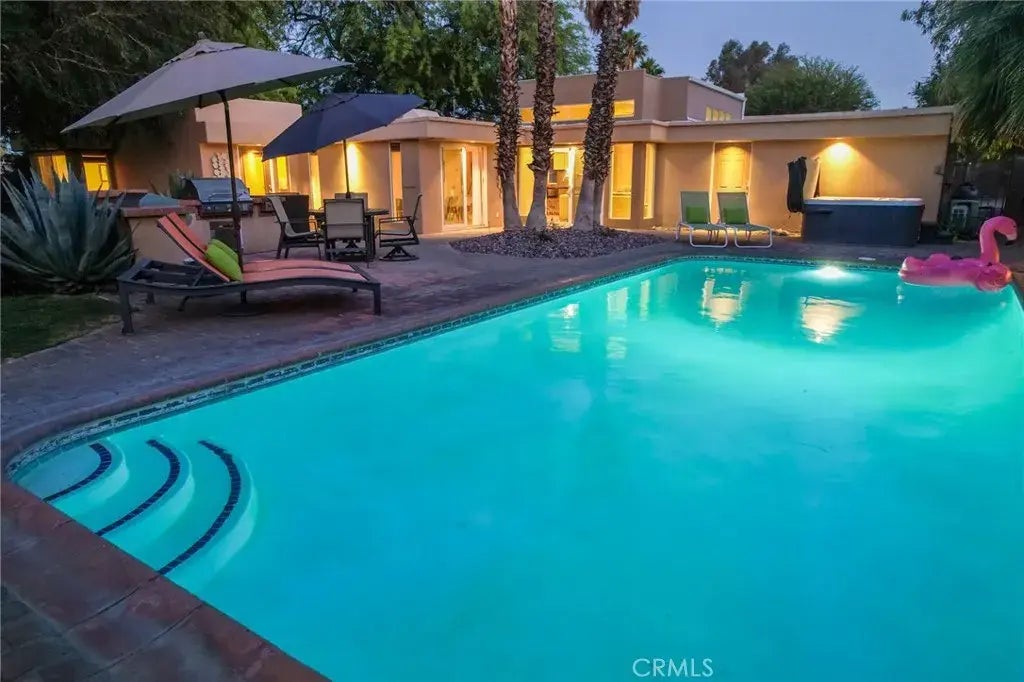 Welcome to Desert Holly House! A 3 bed, 2 bath charmer with an amazing layout and cheerful, bright energy that feels quintessentially "Palm Springs"! This 1959 Alexander Home was originally designed by renowned architects Palmer and Krisel. It has a wonderfully spacious floor plan flooded in natural light and featuring both a family and living room that open up onto a lush oversized backyard with a sparkling pool, majestic trees and dramatic mountain views and pastel desert sunsets! Two lovely bedrooms overlook the beautifully manicured landscape. The ultra spacious primary suite is a true retreat with a reading nook, built-in vanity, huge walk-in closet and direct access to a private lounge area and the bright blue pool. Additional features include raised ceilings, a large stand alone spa and a totally finished garage gym with a built-in mini split and insulated garage door. The backyard is your own private desert sanctuary! You'll find yourself surrounded by magic and tranquility in every direction; from the built-in outdoor kitchen, lush fruit trees (Meyer lemons, yum!) to the hummingbirds and lounge areas surrounding the epic pool, you will feel a sense of zen the moment you step outside. This property has been a beloved, highly rated vacation rental with repeat guests for years but also serves as a beautiful canvas to bring your own vision if you chose to make it your own! All in a dream location just a stone's throw from the downtown strip, Victoria park and all the cutest coffee shops Palm Springs has to offer. Comes fully furnished, pets are welcome!