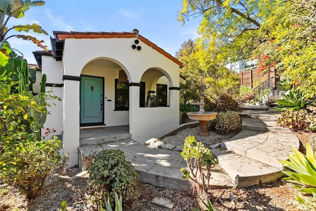 This inviting Silver Lake home blends classic Spanish style with vintage charm, creating a warm and comfortable retreat. Set behind a fully fenced lot, the low-maintenance yard features citrus trees and succulents, offering a peaceful outdoor space to unwind. The front door, painted in cerulean blue with original hardware, welcomes you into a home filled with timeless details. The spacious living room provides ample space for relaxing or entertaining, with a picture window, period light fixtures, and a coved ceiling adding character. Original hardwood floors and updated dual-pane wood windows flow into the separate dining room, just off the vintage kitchen with views of the garden. Three bedrooms are tucked down a central hallway, along with a full bath featuring original 1930s purple tile. One bedroom has its own bonus 3/4 bath, adding convenience and charm. A separate garage with extra storage is located at street level. Ideally situated near Whole Foods 365, Silver Lake Wine, the Reservoir, and the Library, this home offers the perfect balance of comfort and location.