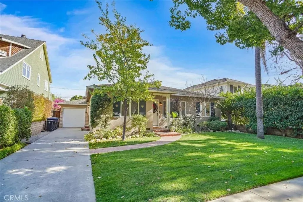 Location, Location, Location! Nestled on one of the most sought-after streets in Burbank's Western Rancho, this beautifully maintained traditional Mid-Century Modern home sits on an oversized lot, offering both space and charm. As you approach, you'll be greeted by a meticulously landscaped front yard and a winding brick path that leads to a striking front door. Upon entering, you'll immediately appreciate the sense of openness, with a clear line of sight through to the serene backyard. Gleaming hardwood floors flow throughout the home, enhancing the light and airy ambiance. The spacious living room features a tiered ceiling, large windows, and a cozy gas fireplaceperfect for both relaxing and entertaining. The formal dining area offers ample room for gatherings, complemented by recessed lighting and sliding glass doors that open directly to the backyard. The kitchen retains its classic 1940s charm with original curved wood cabinetry, tiled countertops, and stainless steel appliances. The cork flooring adds character, while pendant lights provide both style and function. A generous kitchen nook with a built-in hutch offers the perfect spot for casual dining and sliding doors to the patio. For added convenience, there is a large laundry area adjacent to the kitchen. The private master, located at the back of the home, features wood floors and a spacious closet. Off the central hallway, you'll find a full bathroom with vintage looking tilework and a large soaking tub. The second bedroom, located at the front of the home, also doubles as an ideal office with a large closet. A