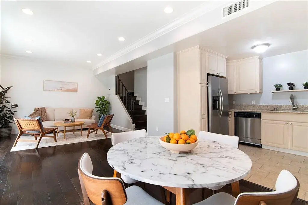 Tucked away at the end of a quiet cul-de-sac in the heart of the NoHo Arts District, this contemporary 2-bedroom, 2.5 bath townhome offers privacy, style, and unbeatable convenience. Located in an intimate, well-maintained complex of just 7 units, this residence combines modern living with urban accessibility, just steps from the Chandler Bike Path. Step inside to an open-concept main floor featuring sleek dark hardwood floors, recessed lighting, and oversized dual-pane windows that bathe the space in natural light. The spacious living and dining areas flow seamlessly into the open kitchen, complete with granite countertops, maple cabinetry, and stainless steel appliances. A convenient half bath and a storage closet are also located on the main level for added functionality. Upstairs, you'll find two generously sized bedrooms, each offering ample closet space and easy access to full bathrooms that are both equipped with tubs. The stackable washer and dryer are conveniently located upstairs for added ease. Additional highlights include a newer HVAC system with Nest thermostat, installed in 2022, a private courtyard for outdoor relaxation, gated underground parking with two 2 tandem designated spaces, and secure gated entry. This home is located in one of LAs most dynamic and culturally rich neighborhoods. The NoHo Arts District is a thriving hub for creativity, known for its numerous theaters, art galleries, music venues, and boutique shops. It's a walkable community filled with trendy cafes, gastropubs, and vibrant nightlife. Whether youre seeking a stylish, move-in-ready h