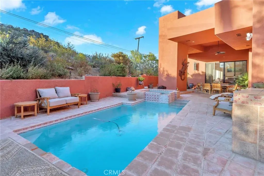 Custom built with classic elegance & style yet bursting with historic charm, 2 marble fireplaces and matte porcelain terracotta style tile inside and out, and tons of light. The Southwestern estate's character is seamlessly blended with old Hollywood charm and energy-efficiency to ensure integrity & function for turn-key living. The desert vista views of the San Gorgonio Mountains are visible from all three sitting areas of the formal living room, family room and formal dining room through the enormous windows which allow light to fill the open space design. The heart of the home, the kitchen, is a chef's delight, featuring a 6-burner built-in stove and oven, dishwasher, and trash compactor. Whether you're hosting a dinner party or preparing a household meal, this kitchen is equipped to handle it all. A magnificent primary suite awaits you with a marble fireplace, floor to ceiling windows and sliding glass doors that lead to your very own charming courtyard patio with direct access to the backyard oasis. The suite also includes two walk-in closets and two water closets complete with a jetted tub and walk-in shower. On the other side of the house, there are three guest bedrooms and two large guest bathrooms and a huge laundry room featuring a sink and an abundance of storage cabinets. Private & secure approx 1.74 acres wrapped in gated stone walls and chain link features mature landscaping fit for a painting with the San Gorgonio Mountains framing the property's views. The ultimate entertainers backyard includes a covered patio, outdoor kitchen with fridge, refreshing swimmi