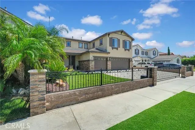 Highly desirable home in the beautiful city of Fontana in the Stratham communities. This home has a remodeled kitchen with built in appliances, granite countertops and matching island, newer vinyl flooring, fireplace has been updated with glass rock, backyard has a new patio cover with electrical outlets, recessed lighting and ceiling fan, upstairs will you find 5 bedrooms and a loft, downstairs has a beautiful airy family room, formal living room and separate dining area. The primary bedroom has double sinks, walk in closet, shower and large tub, downstairs has a den perfect for a 6th bedroom option or a guest room with the downstairs bathroom is only a few feet away, all three bathrooms have been updated , downstairs, separate indoor laundry room, recessed lighting, energy efficient dual pane windows, planation shutters, backyard upgraded with modern pool, water fall, Baja shelves with built in umbrella sleeves, Pentair pool equipment and 6 person jacuzzi, beautiful iron front door with built in screen, gate motor has been updated along with a new key pad. Security cameras came with the home and will stay with the home along with security TV and equipment. A must see property.