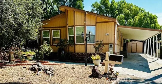 Welcome Home to the desirable Casa Volante 55+ community in Rancho Cucamonga. It is centrally located near the 10 and 210 freeways, close to shopping, restaurants and minutes from San Antonio Hospital. This double-wide mobile home is very unique as it sits on a very LARGE corner lot within the community it boasts a beautiful, TRANQUIL garden that wraps around the home and is fully fenced in a perfect place to relax, unwind and to have a secure area for a small pet. There is also a covered patio with plenty of space and it is fully shaded. Upon entering the front door, you are greeted with an open concept living room and dining room floor plan adorned with laminate wood flooring. The kitchen has granite countertops, stainless steel appliances, a center island, an additional breakfast nook large enough for another small table and plenty of cabinet space with a pantry. Bonusright off of the kitchen area there is a laundry room area with a utility sink and extra cabinet space. The main bedroom has an en-suite bathroom with dual sink spaces and vanities with granite countertops, a large bathtub, walk-in shower and a very large closet. The additional two bedrooms are very spacious and have brand new carpet. One of the bedrooms also has a walk-in closet. Additional noteworthy features include ceiling fans in the kitchen, living room and all of the bedrooms, all of the windows have blinds and/or window coverings and there is also a large, covered carport with a storage shed. The Casa Volante community features a sparkling pool and spa, a clubhouse, library, billiards room and a c