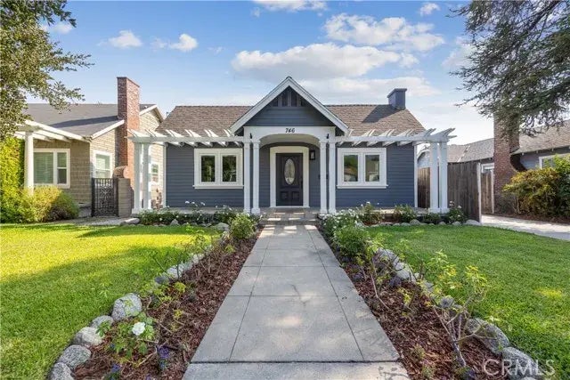 Welcome home to beautiful 746 East Foothill Blvd in the desirable city of Monrovia. This renovated 1920s Bungalow features 2 bedrooms, 2 bathrooms, a separate living room and dining room, and indoor laundry all on one level. The kitchen has been remodeled with upgraded cabinetry, quartz countertops, and backsplash, a new stainless range and microwave, and tile flooring. The kitchen has plenty of counter space and natural light through the multiple room windows. This home also features hard surface laminate flooring throughout and tile flooring in wet locations, original built-ins located in the hallway and in the living room adjacent to the fireplace. The windows and sliding door are dual pane, energy efficient and there is also a central heating and air conditioning system in the home. Additional upgrades and amenities include fresh interior and exterior paint, recessed LED interior lighting, new exterior porch lighting, new closet doors, an indoor laundry room, tankless water heater, and new sod grass backyard with an automatic sprinkler system. There is also a basement that can be accessed from the backyard. The basement is a nice bonus area for small storage of garden tools and holiday/seasonal decorations. Parking is plentiful in the long, gated driveway that can accommodate 4+ cars or boat/RV/toy in addition to the detached 2 car oversized 450sf garage that is a perfect ADU candidate. Adding an ADU is a great way to supplement income, offset a mortgage, or for multi-generational living. The backyard is large enough that if you converted the garage to an ADU, there is