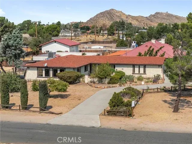 This charming single-story, 1,707 sq. ft. home from the late 1970s offers a fantastic opportunity for those ready to give it some TLC. Located on a sprawling, nearly 1-acre corner lot, this 3-bedroom, 2-1/2 bathroom residence boasts vintage appeal and plenty of potential. The open-concept kitchen flows seamlessly into the cozy family room, which features a wood-burning stove-insert chimney, perfect for chilly evenings. A separate indoor laundry room adds convenience, while the kitchens bar seating makes it perfect for casual meals or entertaining. The spacious master suite offers a relaxing retreat, and a charming courtyard at the porch entry adds to the homes character. Outside, you'll find a circular driveway and beautiful mountain views. Situated minutes from the freeway, community college, restaurants, Hesperia Lake, and retail options, this home blends a peaceful setting with easy access to modern amenities.
