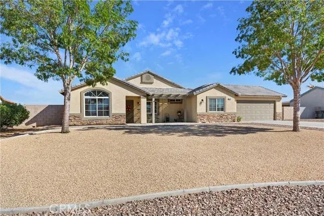Absolutely pristine Apple Valley home in the coveted neighborhood of The Vineyards! Hard to find homes so immaculately maintained! The appeal starts at the front yard, with professionally landscaped rock and concrete curbing, plus a large alumna wood covered front porch for your morning or evening enjoyment. As you enter, the well thought out floor plan of almost 2600 square feet offers you a front living/dining room to the left, the first bedroom/den to the right, and a totally separate west wing for the oversize primary suite and adjoining luxurious bath with double vanity, separate shower and tub, and spacious walk in closet. The kitchen is of generous size with a massive breakfast bar, corian counters, Whirlpool stainless steel appliance, and lots of cabinet space. The kitchen overlooks the family room with lovely views of the back yard, and both kitchen and family room boast 11 foot ceilings for an open and light feeling. The east wing has 3 more generous sized bedrooms plus 2 more baths and a good sized laundry room. The flooring throughout is a neutral wood look tile and carpet. A large sliding door in the family room takes you to a back yard that would be an entertainer's delight! The gated rear concrete patio stretches the length of the home and features a 15 x 41 ft alumna wood patio cover, ceiling fans, lighting, and a 6 person above ground spa! The rear lot is surrounded by block walls, beautifully landscaped with rock, pomegranite and apricot trees, a private white picket fenced sitting area covered with grape vines, an 8 x 16 ft shed with power tucked in the c