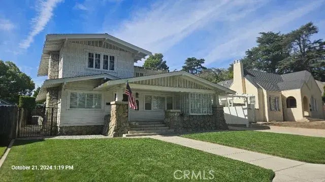 STATELY GREETINGS await you and your family as you step into this fabulous, pristine, historic and masterly crafted California Bungalow style home, built in 1914 on the famed Euclid Avenue Historic District of Upland. Elegance begins with the ambiance of the Formal Living Room complemented by a cozy Fireplace framed by a splendid mantle to live for. Tasteful design, quality renovations, and upgrades include a modern Kitchen opening to an inviting Family Room ideal for memorable gatherings. Look at this newer chefs dream Kitchen offering premium custom milled cabinetry, premiere Stainless Steel gas Oven/Range, Dishwasher, elegant Quartz Counter Tops extending to an extraordinary island. Butlers Pantry Quarters offers a convenient sink and generous cabinet space. Ceiling Crown moldings capture the personal touch in design elevated by the highest standards in skim coated ceilings and walls. 3 large bedrooms offer original professionally resurfaced hardwood flooring and individual split unit heating and air conditioning. You must experience the tour to appreciate the details of this magnificent masterpiece. Hurry!