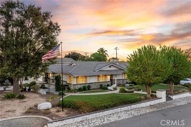 Unbelievable remodeled Red Hill Residence situated on a commanding corner lot with a pool & spa, RV garage, additional two car garage, 40 owned solar panels, and two 10kW batteries. Manicured landscaping features mature trees, drought tolerant artificial turf, concrete pathways, planters, and a fountain. The iron and glass front door open to an entry way with LVP flooring and to the family room featuring exposed beam ceilings, a floor-to-ceiling stacked stone fireplace, a wall of sliding doors overlooking the backyard. A dining room transitions into the completely remodeled kitchen featuring a built-in GE Monogram refrigerator, classic white cabinetry, quartz countertops, grey subway tiled backsplash, black stainless appliances, an island with a gas cooktop and countertops seating, a sliding door to the back patio, and a kitchen sink overlooking the front yard with plantation shutters. A separate powder room for guests is just off the hallway. The primary bedroom opens to a spacious retreat currently used as a home office and features a built-in desk and cabinetry. The bedroom features vaulted ceilings, newer carpeted flooring, a built-in wet bar, a slider to the backyard with shutters, a corner fireplace finished in stacked stone, and two ceiling fans. The primary bathroom offers dual sinks with quartz countertops, framed mirrors, and a custom walk-in shower with a frameless glass enclosure. Two additional bedrooms both with ceiling fans and windows with shutters. The full hall bathroom offers granite counters and a shower/tub with a sliding glass enclosure. The RV garage