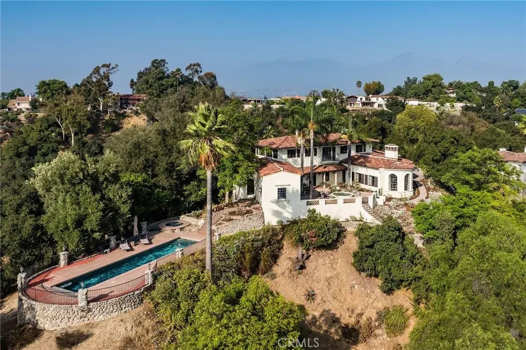 Vintage1930sSpanish estate, located on over an acre at a promontory point in Pomona's prestigious Ganesha Hills. A gated driveway welcomes you, lined with animpressiveoak tree grove. Step inside to a formal foyer that invites you towards the heart of the homethe magnificent main living room. At the far end, three floor-to-ceiling arched windows framegorgeoussouthern views, filling the space with natural light. Adjacent to the living room, an intimate dining room leads to a handsome butler's pantry, guiding you to the kitchen. The grand living room serves as an exceptional formal room or spacious dining hall. A spacious main terrace features a beautiful fountain at its center, creating a tranquil ambiance. Around the sitting area, colorful native landscaping seamlessly blends with the hillside surroundings. The outdoor dining area boasts a stunning groin vault ceiling, supported by intricate columns and archways. Beyond, the pool extends to a scenic point, offering breathtaking views of the Pomona Valley. A shaded patio at the end of a winding path through the oak grove, features a cozy stone fireplace, ideal for intimate gatherings.