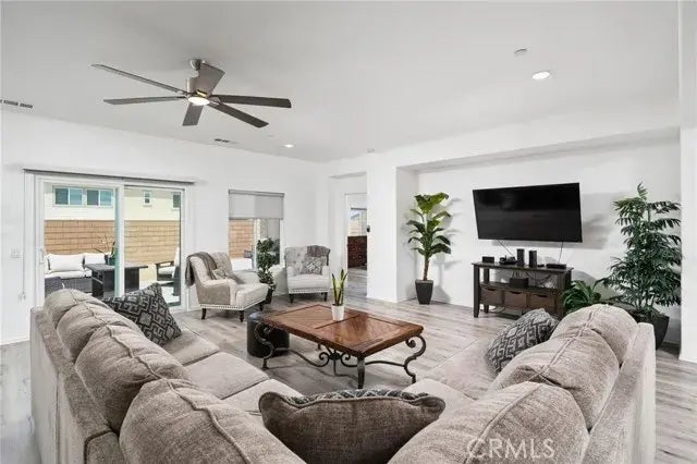 This beautifully maintained residence features 4 spacious bedrooms and 3 full bathrooms, ideal for comfortable living and entertaining. As you step through the long, inviting entryway, you'll be greeted by an open floor plan that seamlessly integrates the living, dining, and kitchen areas, perfect for modern living. The home boasts elegant bamboo water resistant laminate flooring throughout, ensuring both durability and style. Two master bedrooms offer the ultimate in privacy and comfort, each with its own en-suite bathroom. The main master bedroom provides ample space with a master bathroom that is a true retreat, complete with a separate tub and shower, dual sinks, and a walk-in closet with a stylish separate double-door entry. The heart of the home is the stunning kitchen, featuring granite counters, stainless steel appliances, and an oversized island with a breakfast bar, ideal for casual meals and entertaining. There is recessed lighting throughout the house. Ceiling fans are thoughtfully placed in all rooms, adding to the home's comfort. Additional highlights include an indoor laundry room for convenience, custom blinds for privacy and light control, and a tankless water heater for energy efficiency. The guest bedrooms and additional master bedroom are thoughtfully situated away from the master suite, offering both privacy and tranquility. Outside, you'll find RV parking and a front yard with drought-tolerant landscaping, combining functionality with eco-friendly design. This home is a perfect blend of modern amenities and stylish living. Dont miss the opportunity to