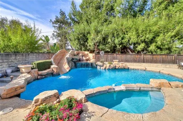 SPECTACULAR NORTH LA VERNE POOL HOME IS AN ENTERTAINERS DREAM! This single story 3 bed, 2 bath stunner features a resort style pool and spa with rock features, a cascading waterfall, grotto, and slide! The remodeled kitchen boasts granite countertops and stainless steel appliances, and opens to the formal dining area and a den. Updated hard surface flooring shines throughout all the common areas. The spacious living room has a magnificent fireplace. Exterior features also include a meticulously landscaped yard, built in gas fire pit, RV parking with 50 Amp electrical and sewage dump, boat parking, and a three-car garage! A backyard gate opens directly to Los Encinos Park, an expansive luscious greenbelt ideal for peaceful scenic walks, sports and playground fun for the kids! The primary bedroom contains two closets including a walk-in, and a newly renovated en-suite master bathroom! Two additional bedrooms are clean and well maintained, and there is another beautiful bathroom that has been remodeled with a modern, stylish design. This home shows true pride of ownership, with countless upgrades including newer windows, electrical, and AC/ Heater, just to name a few. Located in the award-winning Bonita Unified School District within the highly desirable Oak Mesa Elementary School jurisdiction, the property also has views of the foothills and a peek-a-boo mountain view. Solar panels are leased, but paid net of energy production which cut the monthly electrical cost in half! Don't delay, schedule a showing today!