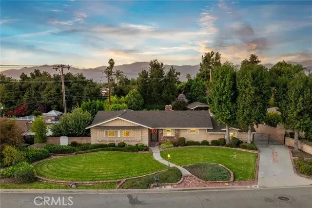 Single Story Home Situated on a Spanning Lot. This charming home features manicured landscape with a green lawn, brick perimeter planters, and a concrete walkway leading to a welcoming covered front brick porch. The front door opens to rich hardwood flooring leading you into a spacious living room with brand new carpet (throughout), a classic brick fireplace, and French Doors that open to the backyard. Adjacent to the entry is open kitchen offering wood cabinetry, tiled countertops, a kitchen sink that overlooks the front yard, offers a breakfast nook, and opens to the family room. The family room features hardwood flooring, rustic exposed beam ceilings, a built-in media center, and a dramatic floor-to-ceiling fireplace with a radius front. A sliding door leads to the back patio and the backyard invites the outdoors in. Down the hallway there's an abundance of storage cabinets leading to three bedrooms. The primary bedroom offers a wall of closets and built-ins, a ceiling fan, a window to the backyard, and an ensuite bathroom. The primary bathroom offers tiled floors, dual sinks with a vanity counter, and a shower/tub with a sliding glass enclosure. The two additional bedrooms are equally inviting, both with ceiling fans, hardwood floors. An additional hall bathroom serves these bedrooms. Last is a laundry room off the kitchen that also provides access to the backyard. The gated driveway pulls all the way through to the rear-facing two-car attached garage and a covered carport for extra parking. The backyard offers a grass area, a brick perimeter lined with mature trees and