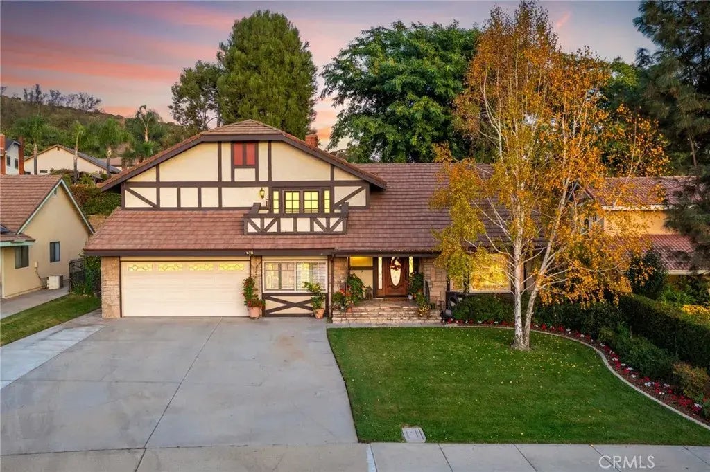 Well maintained home with an open floor plan and spacious backyard with views of the foothills. Beautifully landscaped with a green lawn, a mature tree, manicured planters, and stone steps that lead to the covered front porch, this home presents an inviting facade. The elegant wood and glass door opens to an entryway with hardwood flooring and vaulted ceilings, which continues into the living room. The living room features carpeted floors, a large window overlooking the front yard, and vaulted ceilings. Adjacent to this, the formal dining room includes a sophisticated chandelier, a window to the backyard, and direct access to the kitchen. The updated kitchen boasts wood cabinetry with granite countertops and backsplash, stainless steel appliances, a garden window providing backyard views, recessed lighting, a breakfast nook with French door access to the back patio, and it overlooks the family room. The spacious family room has hardwood flooring, a floor-to-ceiling stone fireplace, beamed ceilings, and an arched window offering a view of the backyard. A transition area with a built-in desk leads to a downstairs office space, which was previously the third bay of the garage (now permitted). Additionally, there is a main floor bedroom, a remodeled bathroom with backyard access, and a laundry area. Upstairs, double entry doors lead to the primary bedroom, which features vaulted ceilings, French doors opening to a view balcony, and access to the primary bathroom. The primary bathroom includes a new custom dual sink vanity, a walk-in shower with a glass enclosure, and a separate