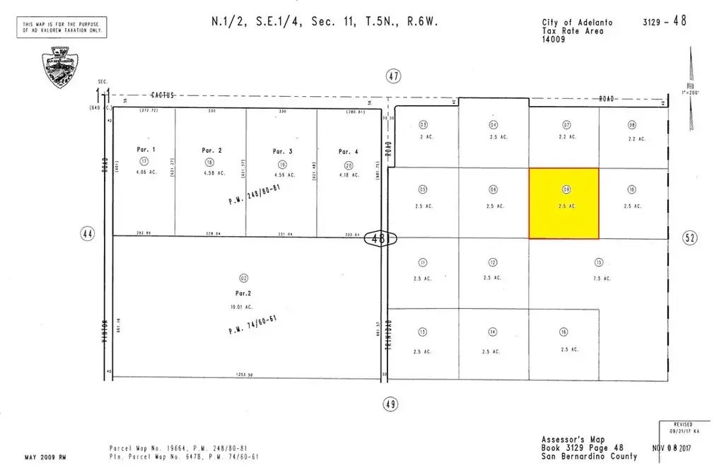 2.5 acres of unimproved industrial land for sale just of Catus and Richardson Rd. in Adelanto; APN: 3129-481-09. Zoned Manufacturing/Industrial (M/I), this lot will permit a variety of heavy industrial purposes, including warehousing, outdoor storage, truck parking, and cannabis cultivation and processing. Located in the growth path, the High Desert continues to expand with many surrounding projects under development from industrial developers. Nearby Southern California Logistics Airport recently completed over 4MM square feet of expansion and is now home to GE Aviation, Boeing, & M&M/Mars, Dr. Pepper/Keurig, Iron Mountain, and more! This site is also approximately 30 miles from BNSFs future Barstow International Gateway (BIG), a state-of-the-art intermodal facility spanning 4,500 acres designed to revolutionize international logistics and distribution regionally and domestically. Buyer to verify all information contained herein. Agent and their representatives are not responsible for the accuracy of these claims.