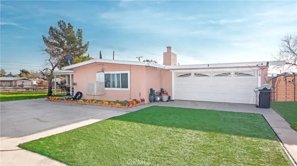 This delightful entry-level home, is situated on nearly three-quarters of an acre lot, that sits in a quiet cul-de-sac. It's conveniently close to schools, shops, and essential eating. This thoughtfully designed two-bedroom, two-bathroom residence exudes style and charm. Upon entering, you'll find a spacious family room, a well-appointed kitchen that is enhanced by a skylight, and a large primary suite that provides direct access to the exterior. The generously sized guest bedroom ensures ample space for visitors. Additionally, the home boasts a sizable enclosed patio, ideal for enjoying windy desert days in comfort. This property includes an attached two-car garage and a fully fenced in lot, which is divided into two sections for added versatility. The circular driveway enhances both the convenience and added appeal of this home. Located in the desirable area of Hesperia, this property offers great value in its price range. Come schedule a visit today before it's gone.