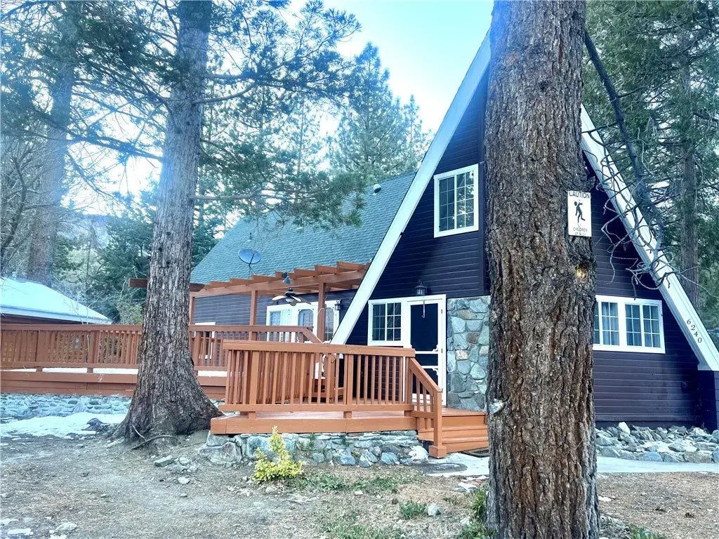 CHARMING A-frame on corner lot in picturesque Wrightwood can be furnished or not. RENT RANGE is $3,000 - $3,400, based on term, credit, furn., ref. Enjoy the welcoming village lifestyle of natural tranquility, yet easy access to highways and major thoroughfares for commuters. Amazing home offers two bedrooms plus 1-1/2 baths on first level, plus an impressive primary suite upstairs. The walk-in closet is unbelievable, plus extra storage room and two separate vanities in huge full bath. Upstairs loft can be used as office, family room or even sleeping area. The home is flooded with natural light through expansive windows, plus skylights throughout. Stay cozy with nest thermostat plus wood-burning insert in fireplace. Gated rear yard holds multiple cars with RV access, plus the 1-car garage with washer/dryer combo. Fenced side yard has shed. Such a peaceful location on flat street, walking distance to school and town. This beauty is available right away! Pets by advance approval of owner, plus deposit. Call agent for details before it's gone. Rent range in $3,000 - $3,400, depending on terms, credit, etc.
