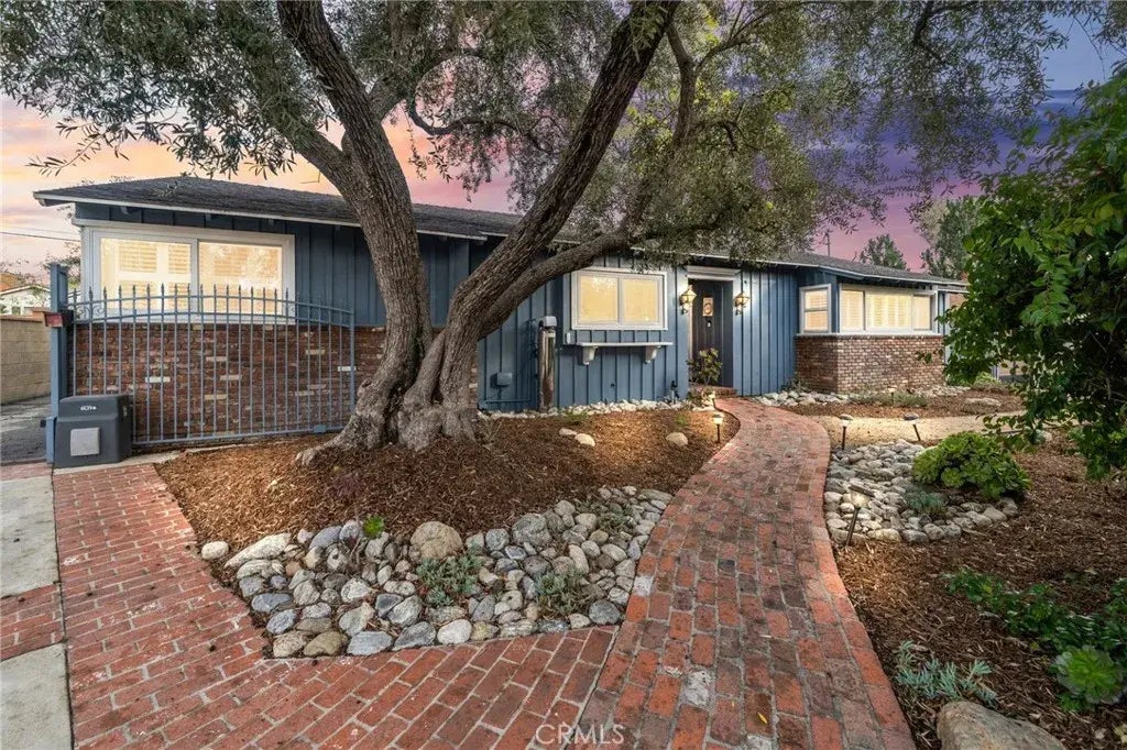Charming Mid-Century Ranch Style. Located behind a lush privacy hedge in the heart of Claremont, this single story house has just been painted inside and out, and offers a welcoming open floor plan with numerous upgrades. Through the front door, beautiful hardwood floors are revealed, which flow through the entire house. Step down into the spacious open living room filled with natural light, and warmed by an attractive raised hearth fireplace with a custom mantle. The dining room is open to the living room, and offers abundant built in storage cabinets under a long buffet surface, topped by a row of windows with wood shutters. The kitchen has stone counters, a built-in KitchenAid refrigerator, stainless steel gas range and oven, and a dishwasher. There is a breakfast counter which provides seating for up to three people, as well as an open line of sight from the kitchen to the living and dining rooms. There are three generously sized bedrooms, including the primary suite with its own private bathroom. One bedroom offers a door directly out to the living room as well as a secondary set of laundry hookups in the closet, allowing an easy option for an indoor laundry area. A beautifully sun-lit enclosed patio is set between the living room and the backyard, and is not included in the square footage. The house is equipped with copper plumbing, an upgraded 200 amp electrical panel, whole house water filtration system, a newer furnace, air conditioner, and water heater. The winding, gated driveway leads to the detached garage, set in the spacious backyard with no lack of space for