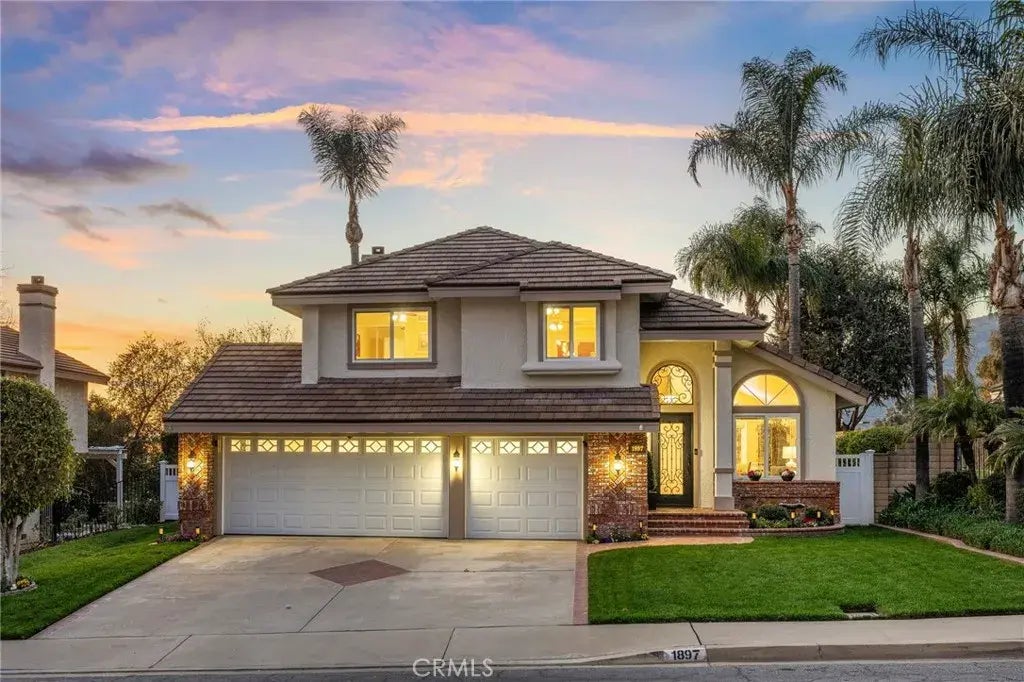Impeccably maintained, one-of-a-kind, with panoramic views nestled in the prestigious North La Verne foothills with award-winning schools. The exquisite low maintenance front yard boasts herringbone brick walkways, a diamond-patterned driveway medallion, deep green lawns, planter boxes, rose hedges, and palm trees extending to the backyard. Enter through a custom iron front door and grille window into a spacious, open floor plan. The formal living and dining rooms feature soaring ceilings, abundant sunlight through upgraded double-paned windows with privacy tint and marginal v-grooves, and custom wall frame molding. Enjoy 6-inch crown molding, tall baseboards, and thick casings throughout. The dream kitchen is fully remodeled with high-end maple cabinets, roll-out drawers, oversized deep Silestone countertops, stainless steel appliances, tumbled marble backsplash, and diagonally laid porcelain tile flooring. A picture window offers jaw-dropping hillside views and stunning sunsets, with a hidden electric blackout shade for privacy. The den showcases a natural gas brick fireplace, custom iron doors, views through a marginal v-grooved glass slider and a side window with fountain views. The laundry room features matching maple cabinets, a deep sink, and additional storage. Step into the most peaceful and private backyard oasis and hear the sound of the 4-tiered water fountain and rustling palm trees. Gaze at lush flowering gardens, a well-manicured lawn, brick planters, Belgard pavers, and a commercial-grade vinyl-covered patio. Head upstairs to the primary suite offering vault