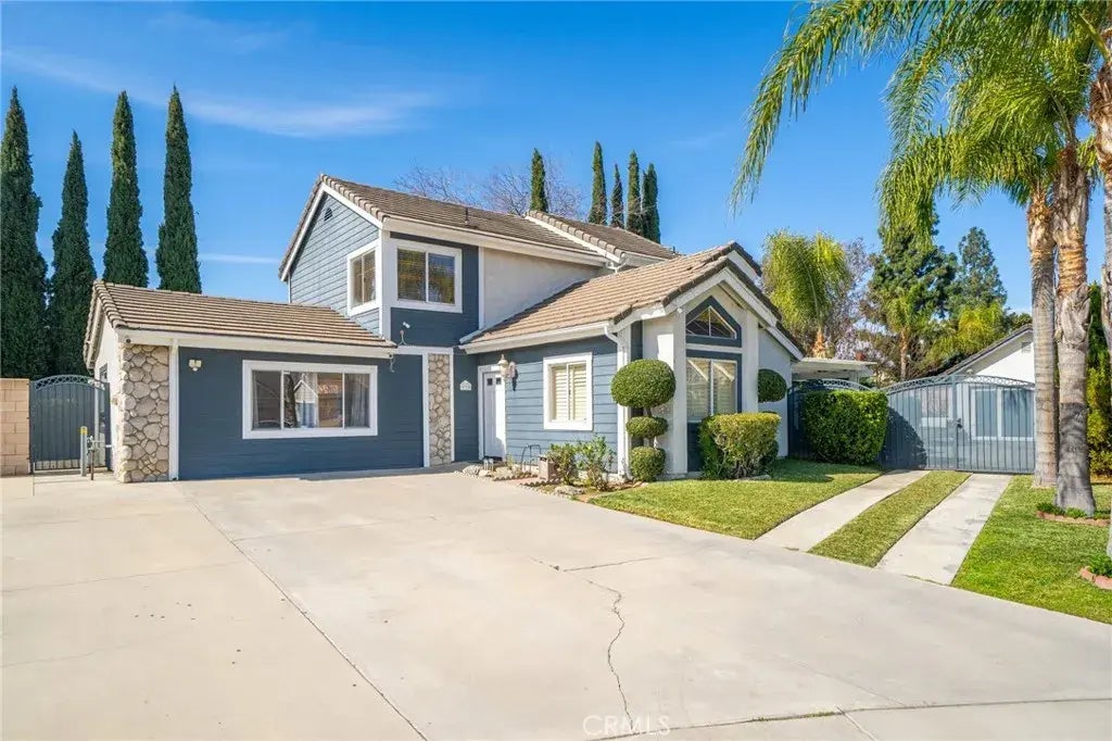 Welcome to 839 E Wisteria Court in Ontario, a charming two-story home nestled in a quiet cul-de-sac. This spacious 5-bedroom, 2.5-bath property offers comfort, convenience, and ample space for the entire family. Upon arrival, you are greeted by a long driveway with plenty of parking, including RV access. The well-maintained exterior features mature landscaping, tall cypress trees, and a welcoming front porch. Inside, you'll find a bright and airy living room with high vaulted ceilings and large windows that fill the space with natural light. The adjacent dining area boasts a cozy fireplace, perfect for hosting gatherings. The kitchen is updated with granite countertops, rich wood cabinetry, stainless steel appliances, and a garden window overlooking the backyard. Downstairs are 2 bedrooms, one of which can be used as an additional primary bedroom as it is generous in size- perfect for multigenerational living. The upstairs primary suite features vaulted ceilings, a walk-in closet, and an ensuite bathroom with dual sinks. Additional bedrooms offer versatility for family, guests, or a home office. Step into the backyard to discover a serene retreat with a spacious Alumawood patio cover, ideal for outdoor dining and entertaining. The expansive lawn provides room for play and is plenty of space for a pool, while the oversized 4 car detached garage offers potential as a workshop, gym, or storage. This structure can also easily be converted into an ADU. Additional highlights include tiled flooring throughout the main areas, newer windows, and a gated side yard for added privacy.