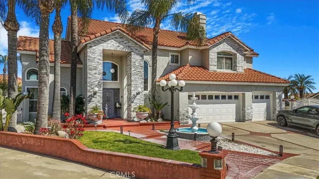 Welcome to this exceptional 4-bedroom, 3.5-bathroom home in northern Upland, blending elegance and comfort. The property features a master suite with a jet tub and double-sided fireplace, a spacious gourmet kitchen, and an entertainer's backyard with a pool and spa. The master suite is a private retreat, featuring a double-sided fireplace that adds warmth and ambiance. The master bath includes a jet tub, separate double showers, and dual vanities for convenience. The spacious walk-in closet provides ample storage. One bedroom on the first floor is perfect for guests or multi-generational living, complete with its own bathroom with a shower. The upgraded kitchen boasts granite countertops and plenty of cabinetry for storage. The home includes both a formal living room with a cozy fireplace and a family room, includes versatile spaces for gatherings. The open-concept layout of the lower level is ideal for entertaining, with high ceilings that enhance the natural light and airy feel. Beautiful tile flooring throughout, including wood flooring on the stairs to add a modern touch. The home features a 3-car garage, one of which is converted into an unpermitted bedroom, providing additional living space. The exterior impresses with natural rock walls framing the front yard, creating a welcoming atmosphere. A large fountain at the entrance adds a touch of elegance, and sprinklers keep the landscaping vibrant. Step outside to the entertainers backyard, complete with a back patio for outdoor dining or relaxation. The bar area with a built-in BBQ adds to the outdoor experience. The po