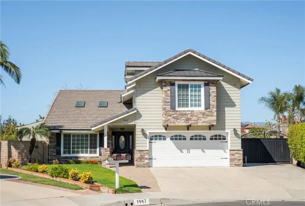 This stunning 4-bedroom, 2.5-bath home is situated at the end of a quiet cul-de-sac and showcases exceptional curb appeal with a stone veneer and board and batten exterior. Inside, high ceilings with dark exposed beams create an elegant and inviting atmosphere. The grand staircase, featuring a luxury banister, serves as a striking focal point, adding a touch of sophistication to the home's design. The gourmet kitchen boasts a large island, granite countertops, and a picturesque window overlooking the backyard, seamlessly flowing into a cozy living space with a fireplace. A beautifully designed half bath and spacious laundry room complete the main level. Upstairs, the primary suite is a true retreat, offering custom closets, a charming window seat, and a spa-like ensuite with a soaking tub under a chandelier, a walk-in shower, dual vanities, and a makeup area. An additional large walk-in closet features custom shelving and a high-end hanging system, providing ample storage and organization. The additional bedrooms are spacious, and the updated hall bath features a double vanity and a tiled tub/shower. The backyard is an entertainers paradise, boasting a resort-style pool and spa, a covered patio with built-in heaters and TV setup, RV parking, a storage shed, and fruit trees. Additional upgrades include new dual HVAC, hardwood flooring, and an updated roof. This exceptional home wont last!