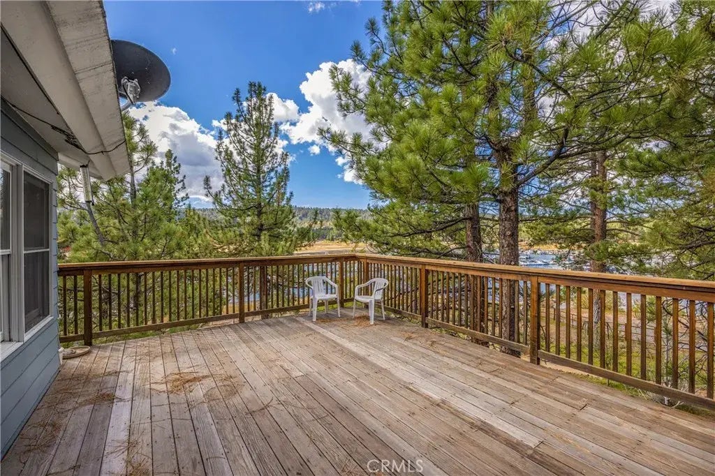 Lakefront Big Bear Cabin Overlooking Metcalf Bay. Discover an extraordinary lakefront retreat perched along the serene shores of Big Bear Lake, offering views of Metcalf Bay and the expansive waters beyond. Framed by majestic, towering pines this cabin exudes rustic charm and modern comfort. The front yard welcomes you with a deep concrete driveway, leading to two oversized garage spaces each extra deep designed with the potential to transform into a four-car tandem garage, depending on your vehicles. A walkway guides you down from the driveway to the front entrance. Step through the door into a foyer with vaulted ceilings and a chandelier. Descend a few steps into the expansive living room where an exposed wooden beam adds to the warmth and character while an adjacent formal dining room offers a place for memorable gatherings. The heart of this home is the great room, a seamless blend of functionality and style. The kitchen features rich wood cabinetry, stainless steel appliances, and a spacious center island with countertop seating. Nearby, a sunlit breakfast nook offers a cozy spot to sip morning coffee while gazing out at the views. Flowing effortlessly from the kitchen, the family room impresses with its own vaulted ceilings, another exposed beam, and a central fireplace that invites you to unwind on chilly mountain evenings. A glass door opens to a sprawling balcony, an outdoor haven with panoramic lake views where you can host summer barbecues or simply listen to the gentle waves below. The main level offers a well-appointed bedroom with ample closet space and direct