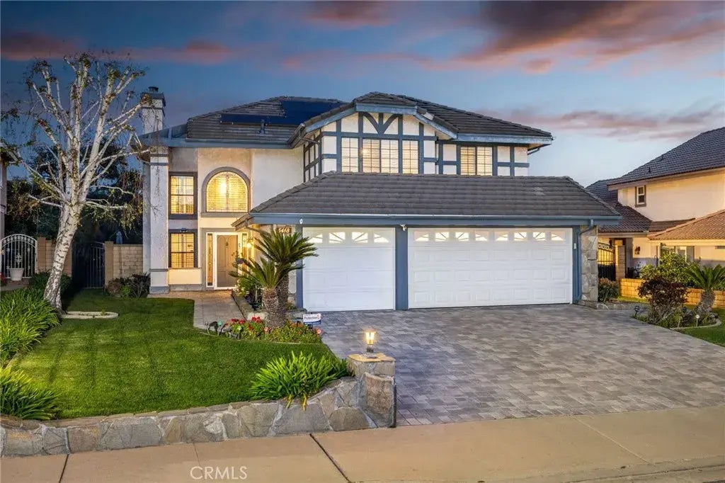 Situated in North La Verne, this captivating two-story home delivers an oversized lot, where sweeping panoramic hill views unfold from the private backyard. The meticulously landscaped front yard features a paver driveway and walkway leading to a charming covered porch. Step inside to find tiled floors and soaring ceilings that flow into a formal living room, highlighted by a marble fireplace and mantle. Adjacent, the formal dining room boasts French doors and side windows with plantation shutters overlooking the pool and beyond, flooding the space with natural light. The updated kitchen showcases wood cabinetry, custom tiled countertops, classic black appliances, and a countertop eating area that seamlessly opens to the family room. A cozy breakfast nook enjoys serene backyard views, while the family room offers tile flooring, a brick fireplace with a mantle, and a sliding glass door leading outside. Convenience abounds downstairs with a bedroom, full bathroom, and a laundry room with cabinetry, which connects to the attached, finished three-car garage. Upstairs, the primary bedroom with vaulted ceilings, a cozy retreat area, and a glass-paneled door opening to a spacious balcony with sweeping hillside views. The primary bathroom features double sinks, a walk-in shower with glass surround, a separate tub, and a generous walk-in closet with custom built-ins. Two additional upstairs bedrooms, each equipped with ceiling fans and Plantation Shutters, share a hall bathroom with a shower/tub combo and sliding glass enclosure. The backyard is an entertainers dream, complete with